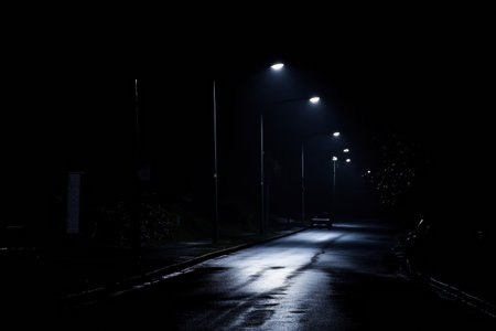 A solitary person walks along an empty street at night, with streetlights casting long shadows and a dark space above for text inclusion.
