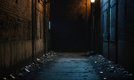 A narrow, dark alleyway with brick walls and trash lining the sides