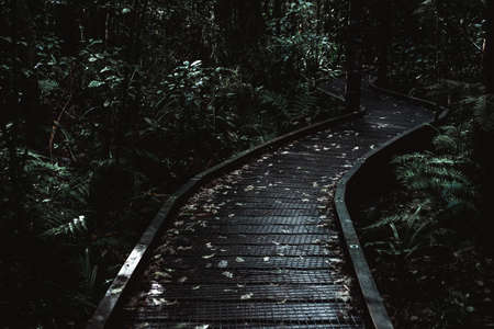 A dense and mysterious tropical forest with dark green foliage and a narrow pathway