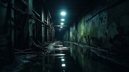 Dark underground concrete utility communication tunnel with pipes and wires in cold colors.