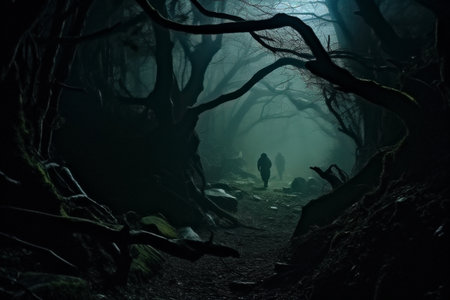 man walking in spooky forest at night