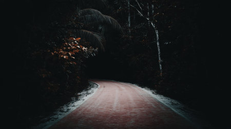 A vertical shot of a road leading to the forest at dark night in winter