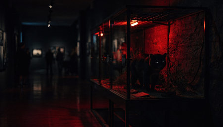 Dimly lit corridor with a nocturnal animal exhibit featuring red lighting focusing on the glass enclosure with blurred background shadows.