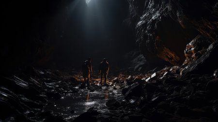 An illuminated exclamation point floats in a dark, cave-like environment, emitting a warm orange glow. The scene features rough, rocky textures and a low-angle composition. Soft, diffused lighting creates a mysterious atmosphere. Suitable for a variety of conceptual, editorial, and commercial applications.