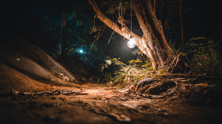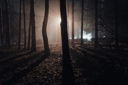 Dark night in forest at fog time. Surreal night forest scene. Horror halloween concept. Magical lights sparkling in mysterious forest at night. Long exposure shot