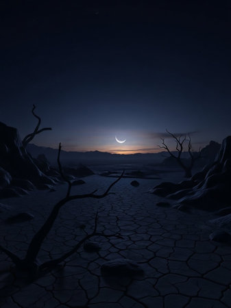 A stark, desolate landscape of cracked earth and dead trees is illuminated by a sliver of a crescent moon in the twilight sky.