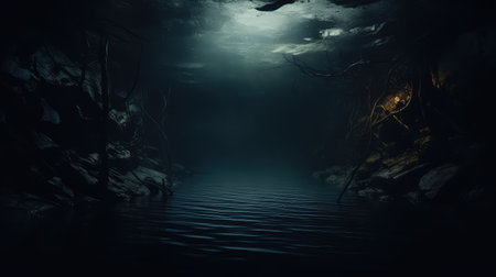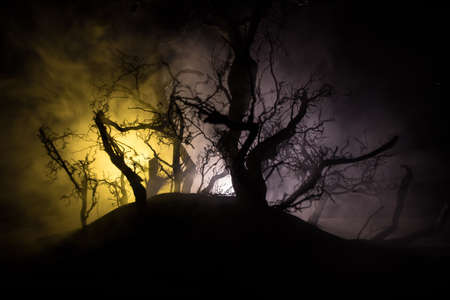 Spooky dark landscape showing silhouettes of trees in the swamp on misty night. Night mysterious forest in fire and dramatic cloudy night sky