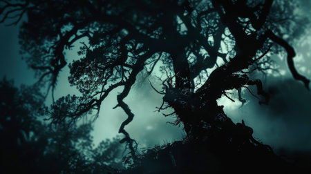 A tree with a dark shadow on it in the fog, AI