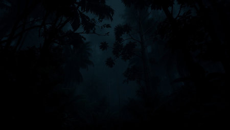 Tropical forest foliage plants bushes in the dark night
