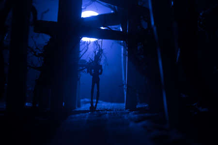 Silhouette of person standing in the dark forest with light. Horror halloween concept. strange silhouette in a dark spooky forest at night