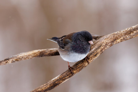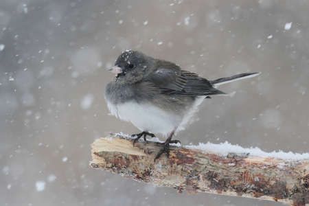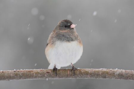 Dark-eyed Junco bird Junco hyemalis perching on a branch during a snowstorm in the Winter