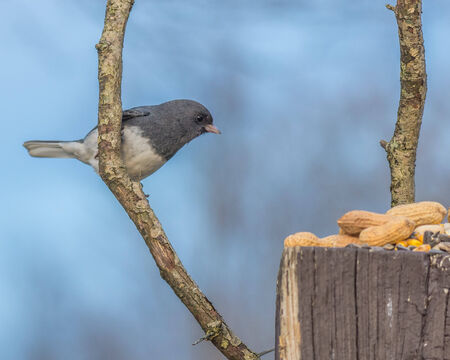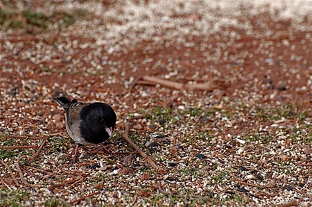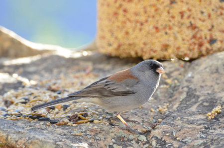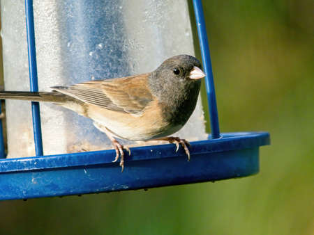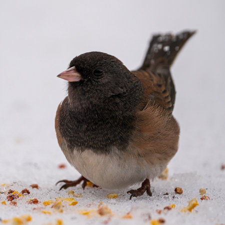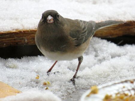 Dark-eyed Junco (Junco hyemalis) eating bird seed during winter.