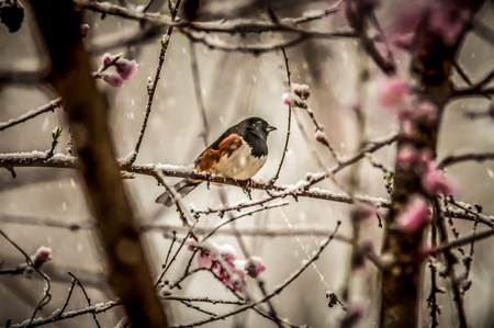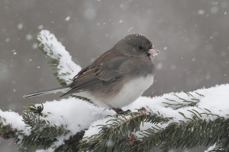 Dark-eyed Junco (junco hyemalis) in falling snow