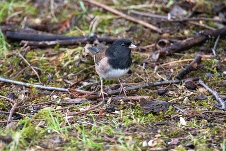 A picture of a male Dark-eyed junco perching on the ground. Vancouver BC Canada