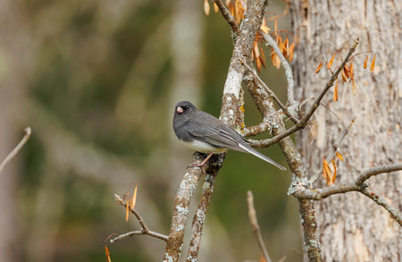 Dark Eyed Junco (Junco hyemalis) resting on a tree branch in a birch tree, California; selective focus, shallow depth of field