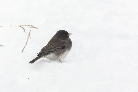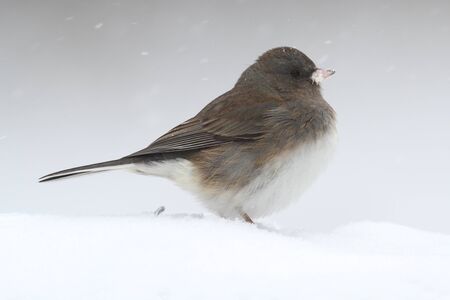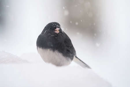 Dark-eyed Junco bird Junco hyemalis standing in the snow in Maryland during a blizzard