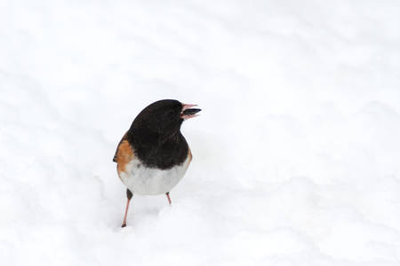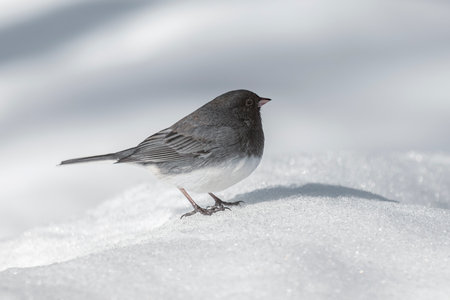 Close-up of a Dark eyed junco in winter, standing in the snow.