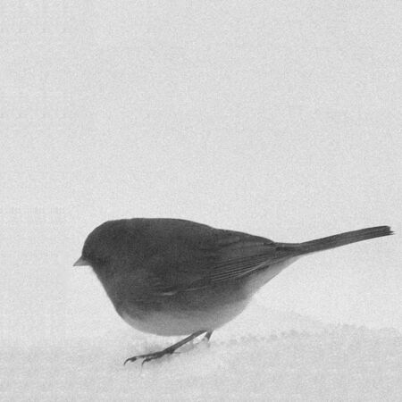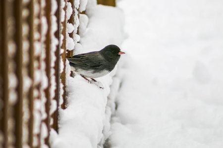 View of a solitary dark-eyed junco bird perched on a snow covered ground during a blizzard