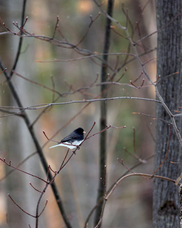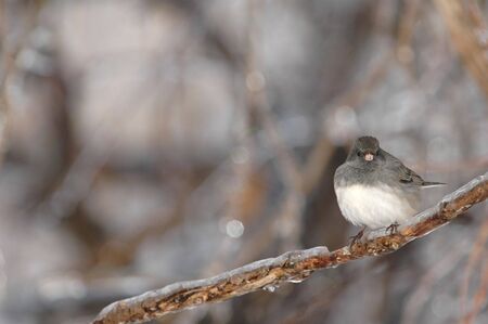 Close up of a Dark-eyed junco (Junco hyemalis) perched on a branch during winter in Wisconsin. Selective focus, background blur and foreground blur.