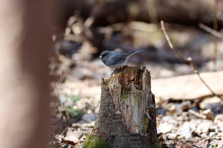 Dark-eyed Junco perched on a tree stump in Wisconsin in the autumn.