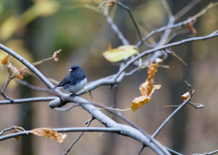 Close up of a Dark-eyed junco (Junco hyemalis) perched on a branch during fall in Wisconsin.