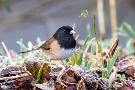 Dark-eyed Junco foraging on the ground in Maryland during the Autumn