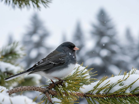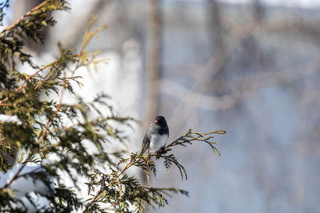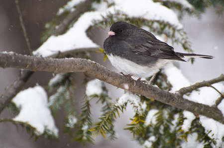 Dark-eyed Junco (junco hyemalis) on a snow covered pine branch in winter