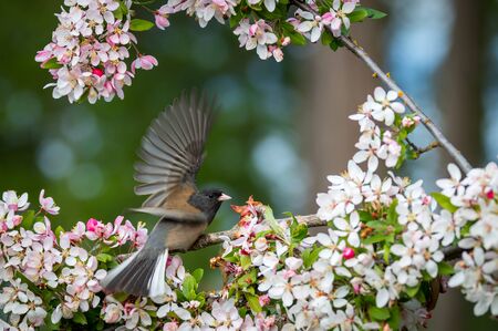 A junco Junco hyemalis takes off from a flowering cherry tree.