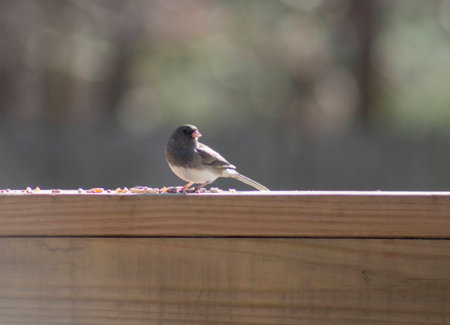 A picture of a female Dark-eyed junco perching on the wood. Vancouver BC Canada