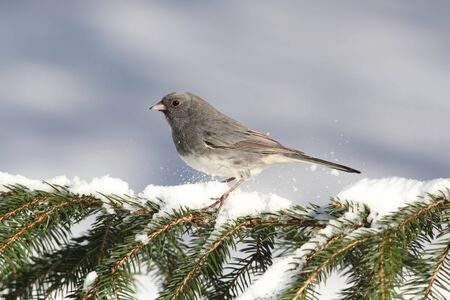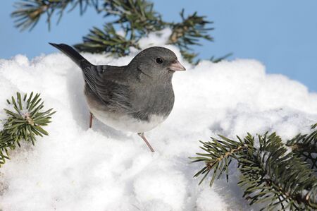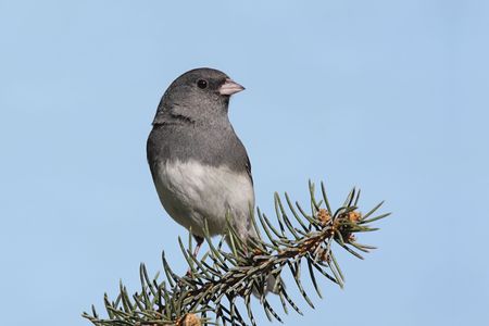 Dark-eyed Junco (junco hyemalis) on a spruce branch with a blue sky background