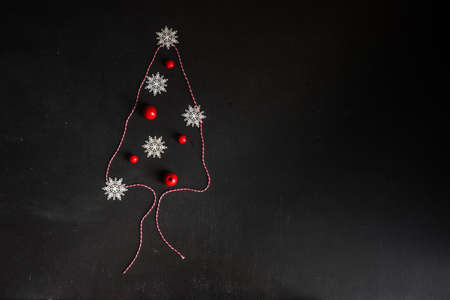 Christmas minimalistic and simple composition in black color. Christmas decorations on black background. Flat lay, top view .