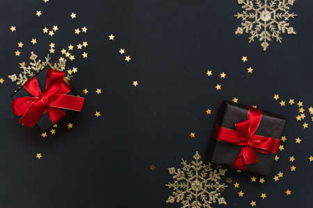 New Years gifts with red bows on a black background with confetti and gold snowflakes and balls. Preparing for a stylish Christmas party.