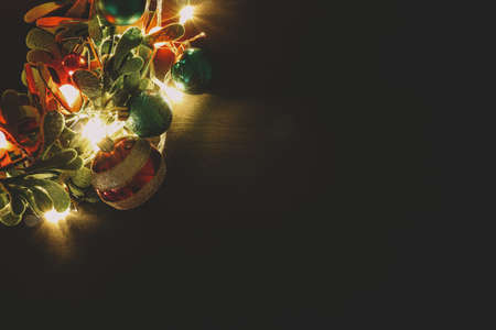 Close up of Christmas decorations on black background with copy space