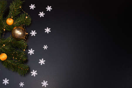 coniferous branches and Christmas tree decorations on a New Year's black background, copy space