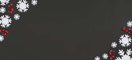Christmas frame made of snowflakes and berries on black background with copy space. Christmas concept. Flat lay, top view