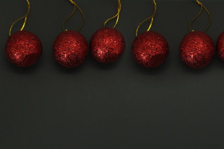 Red Christmas baubles on black background. Top view