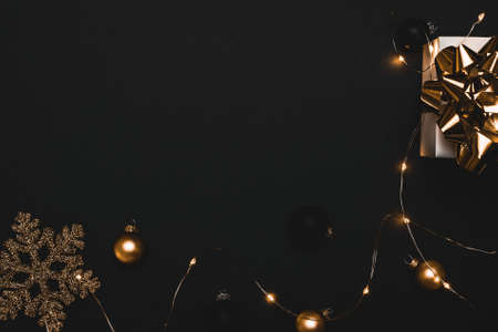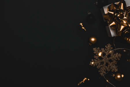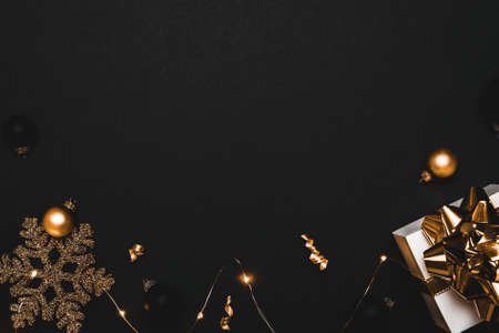 Black and golden Christmas decorations and festive lights on black background.