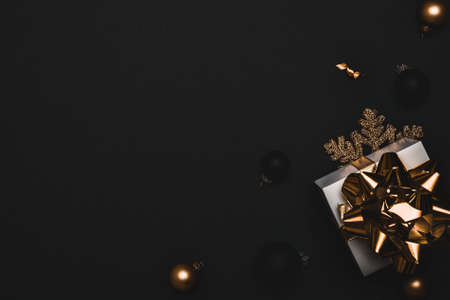 Christmas background golden. White gift box with golden ribbon, New Year balls and sparkling lights garland in xmas composition on black background for greeting card. Flat lay, top view, copy space