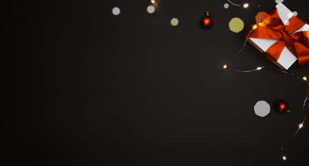 Holiday winter background. White gift box with red ribbon, New Year balls and sparkling lights garland in Christmas composition on black for greeting card. Flat lay, top view, copy space