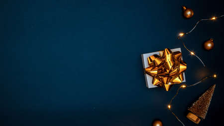 Winter banner. White gift with golden bow, gold balls and sparkling lights garland in xmas decoration on dark background for greeting card. Flat lay, top view, copy space