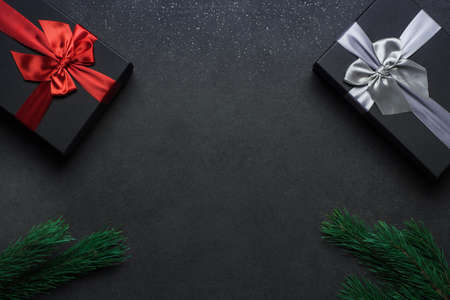 Two gift boxes with red and silver ribbons on a black surface. Christmas tree branch. Place for an inscription.