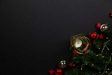Christmas and New Year background with fir branches and red balls on black background. Flat lay, top view, copy space.