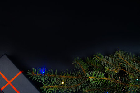Christmas background with fir tree branches and gift box on black background.