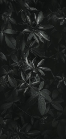 Marvel at the beauty of dark green leaves adorned with dewdrops, capturing intricate textures and the serene essence of nature in a tranquil setting.