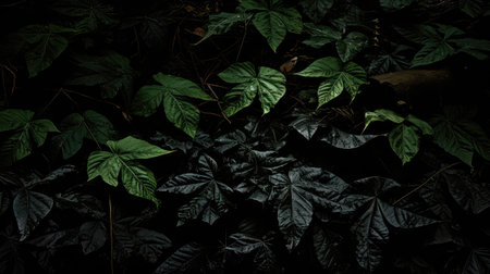 Green plant leaves natural background. Dark moody close up botanical texture. AI Generated content