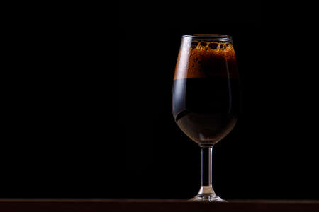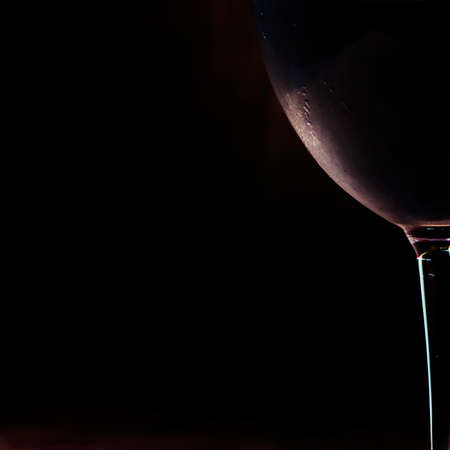 Chilled dry red wine in the glass. Dark vintage wood background. Low key, selective focus.