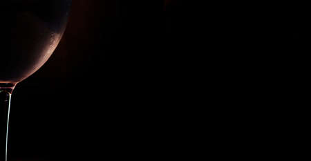 Chilled dry red wine in the glass. Dark vintage wood background. Panoramic banner with copy space