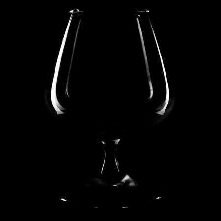 Empty crystal brandy glass on a dark black background in dramatic lighting. Isolated fine dining drinking glass bar & restaurant