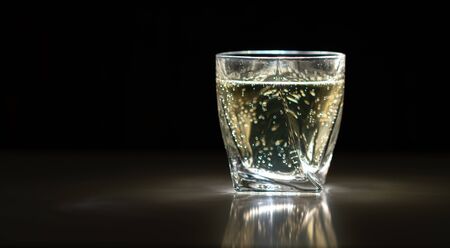 Sparkling drink or beverage in a glass or tumbler with selective lighting on a dark reflective surface with copy space