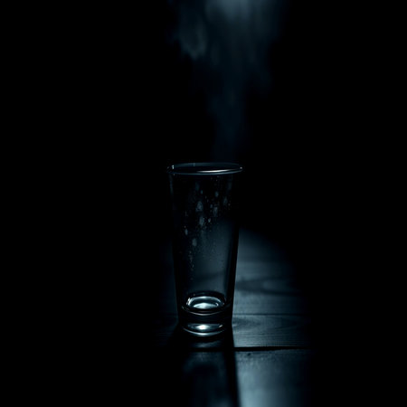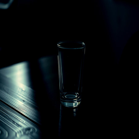 Crystal whiskey glass on a dark, wet surface with bokeh lights